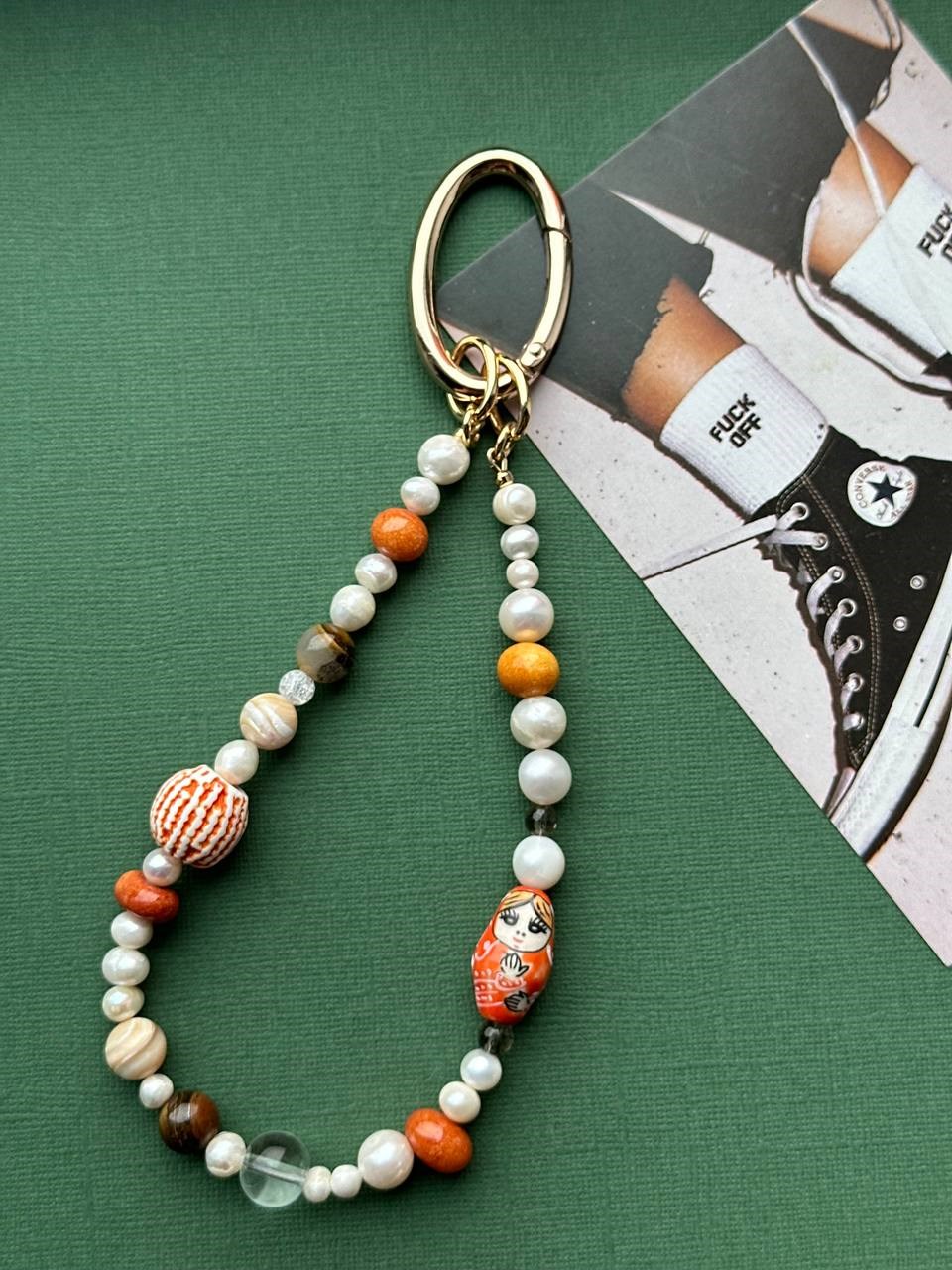 Брелок-обвес на сумку/рюкзак с матрешкой из керамики, натурального жемчуга, керамических бусин, чешского стекла и перламутра