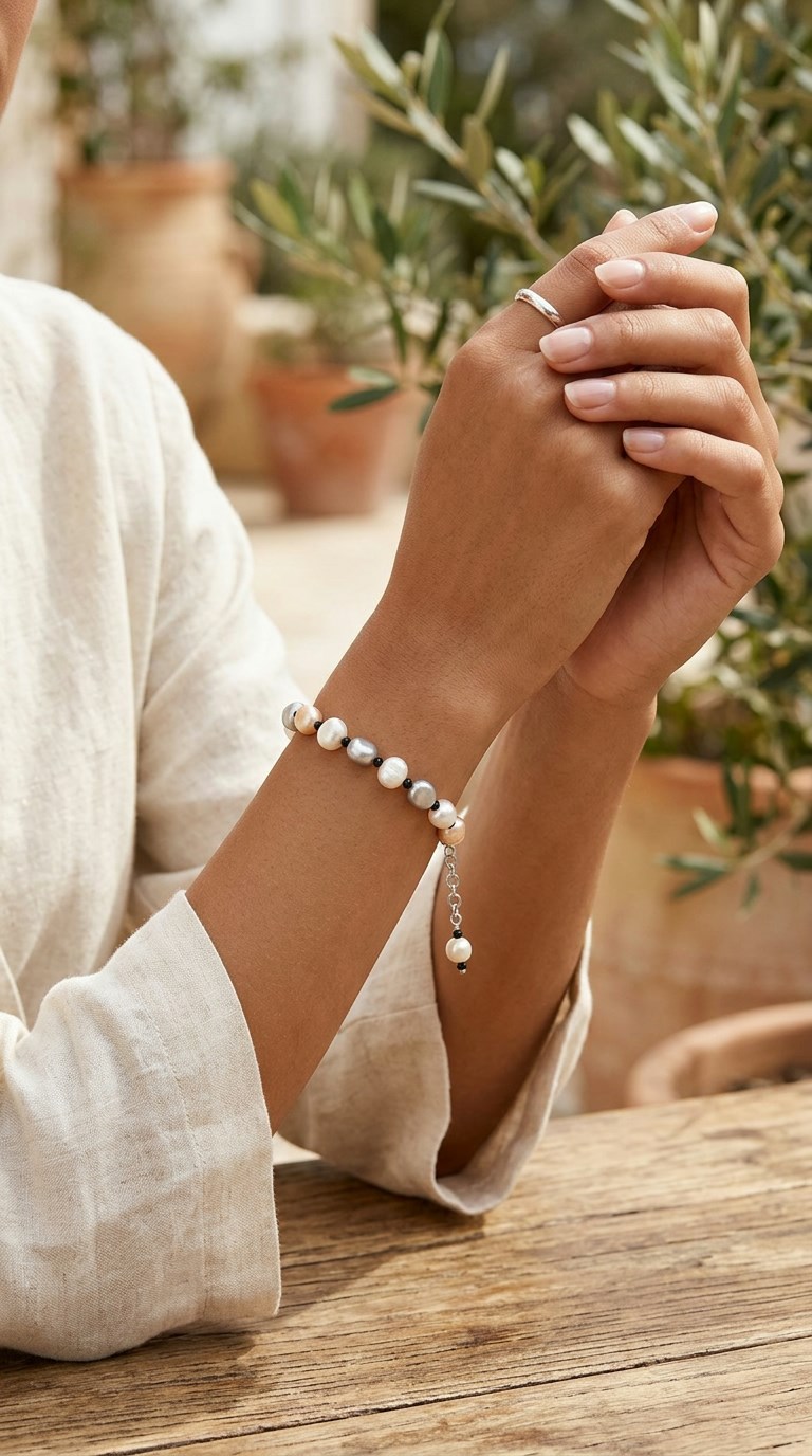 Браслет из натурального жемчуга белого, розового и серого цветов, черного чешского стекла и ювелирного сплава с родиевым покрытием. Длина 23 см