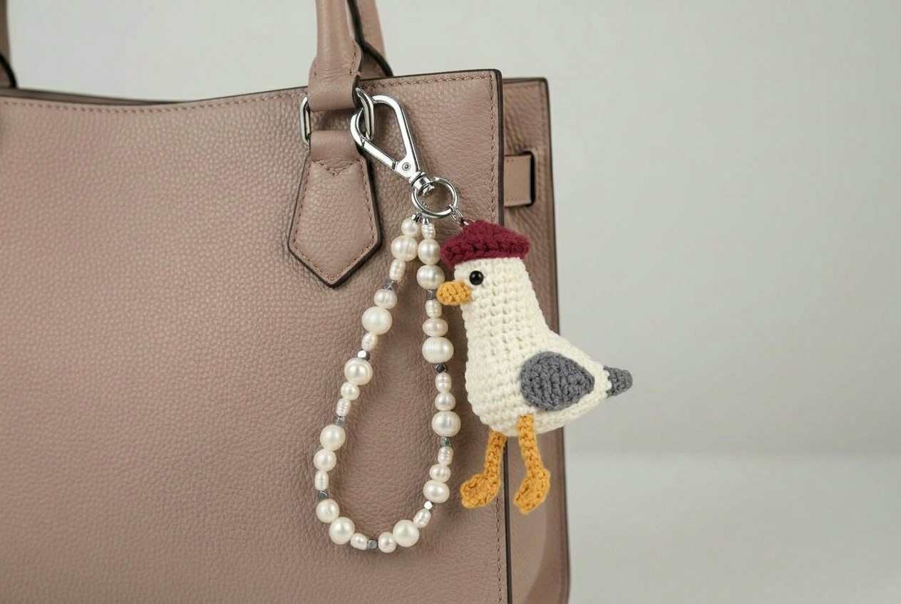 Брелок обвес на сумку из белого натурального жемчуга, гематита и чайки ручной вязки с карабином из ювелирного сплава с родиевым покрытием. Длина 17 см