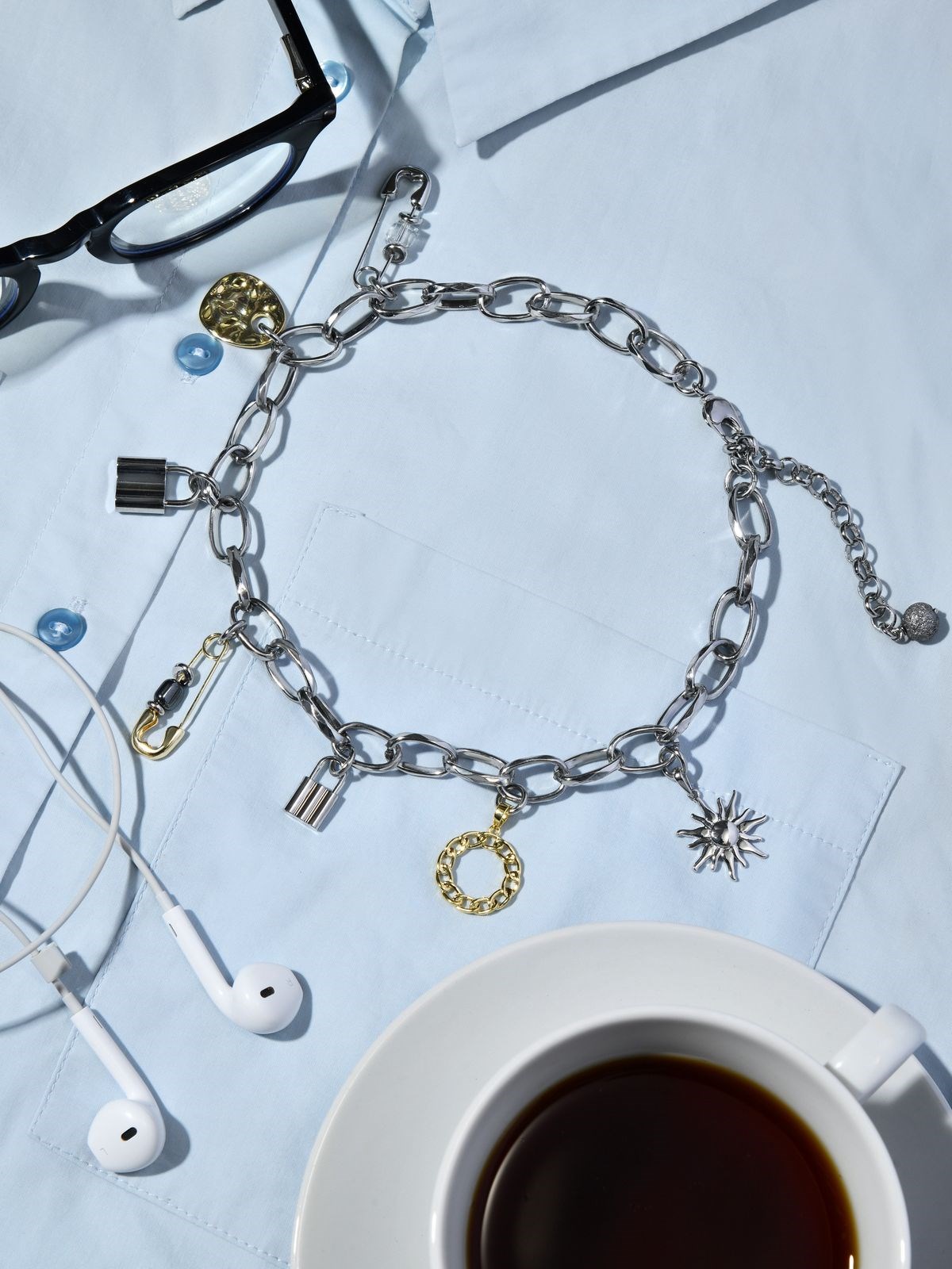 Колье из ювелирного сплава с родиевым покрытием с различными подвесками биколор и вставками из стекла и гематита. Длина 46 см