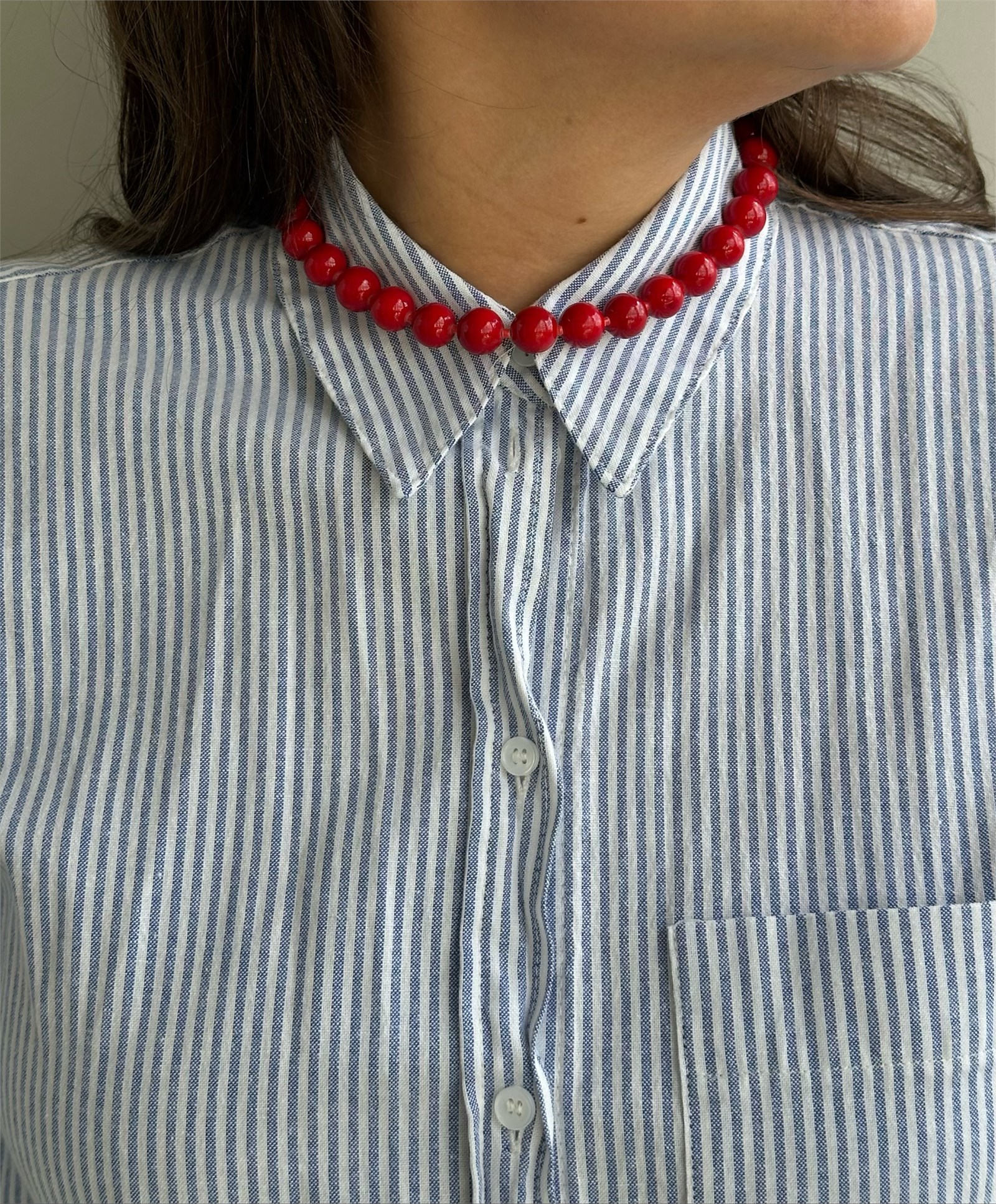 Колье из красной майорики, красного бисера и ювелирного сплава с родиевым покрытием. Длина 46 см