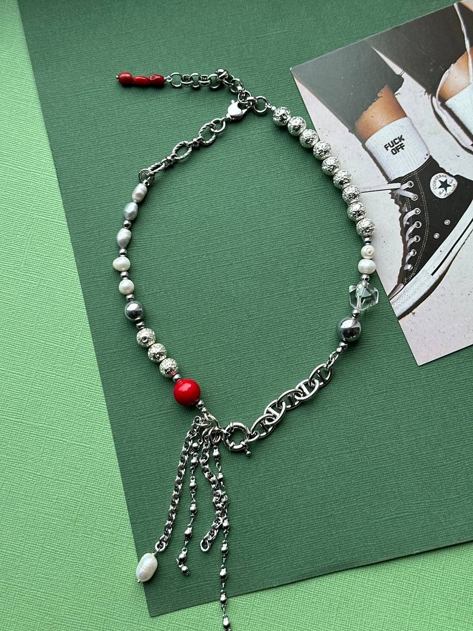Колье из натурального белого и серого жемчуга, лавы, горного хрусталя, майорики, кораллов и микса цепей